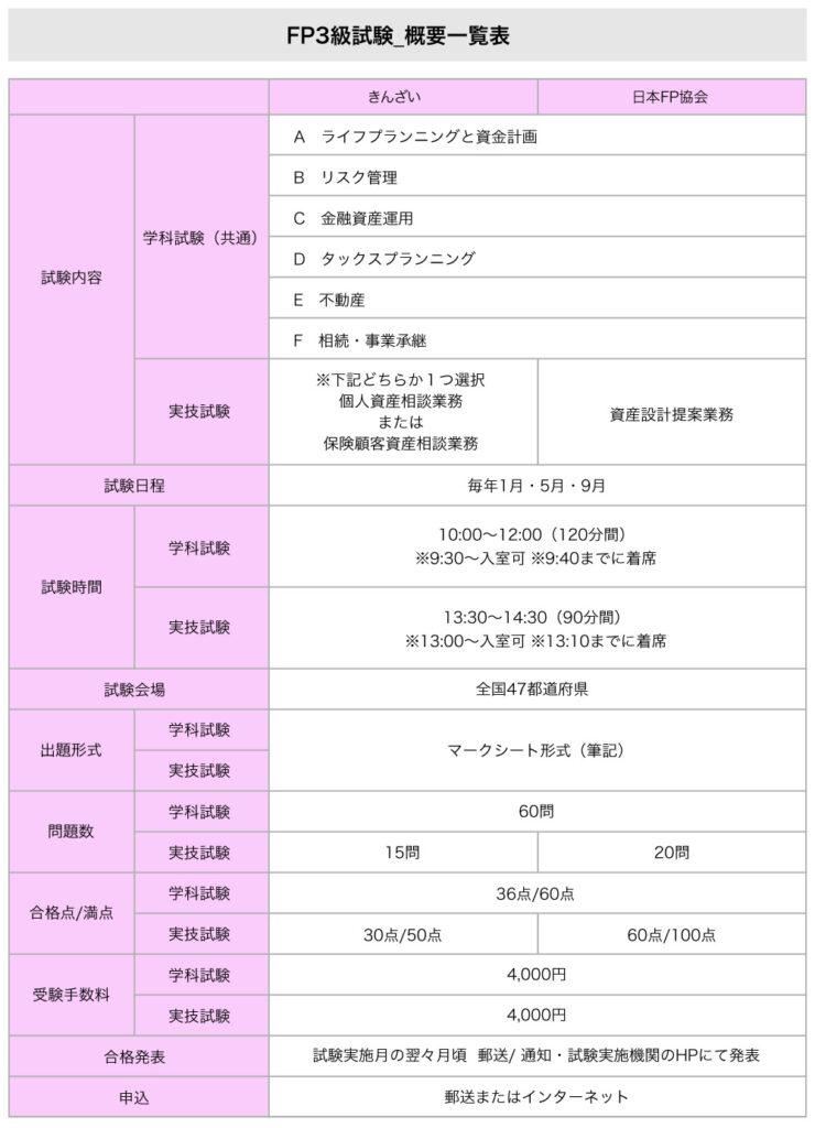最後に、FP3級試験の概要をおさらいしておきましょう。