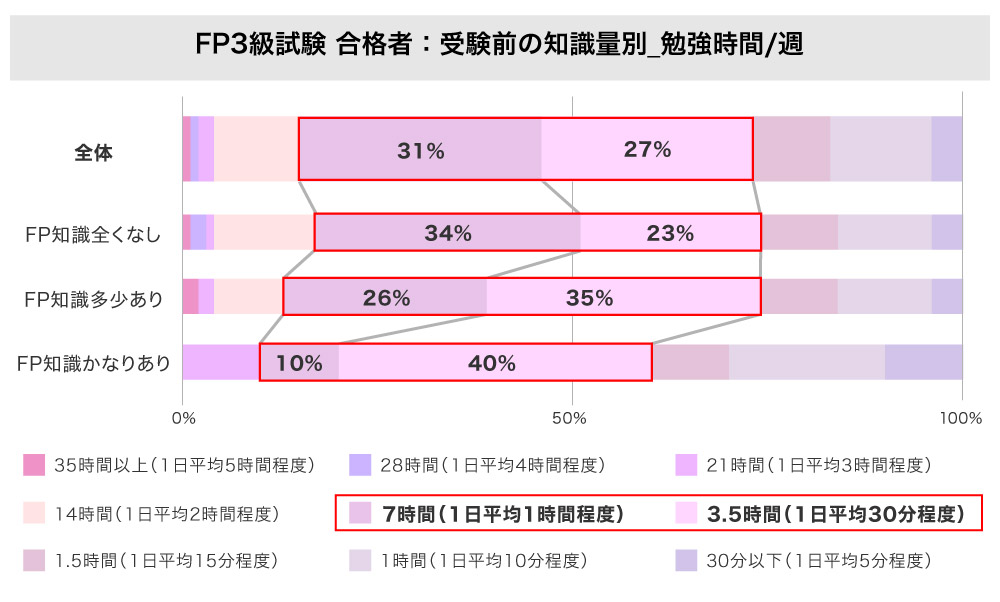 | FP3級の合格者に対して行った弊社独自アンケートによると、 FP3級試験対策での「1週間あたりの勉強時間」について、「7時間(1日平均1時間程度)」と「3.5時間(1日平均30分程度)」が最多に。 ![]() なかでも、FP3級試験受験前のFP知識別に集計すると、 受験前のFP知識が「かなりあり」「多少あり」と答えた人の1週間の勉強時間は3.5時間が最多、「全くなし」と答えた人の1週間の勉強時間は7時間が最多でした。 |