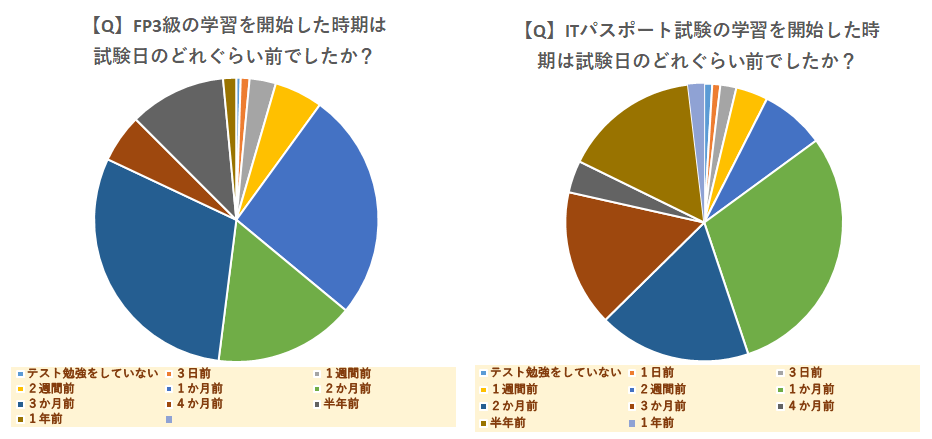 試験の学習時間についてはITパスポートは「1か月前」に開始する人が多いところ、FP3級は「3か月前」から学習する人が多く、必要勉強時間はITパスポートよりも多くなると思って良さそうです。ただ上記は「1日何時間勉強したか」でも大きく事実が異なるため、3か月勉強すれば…というものではないのでご注意ください。
