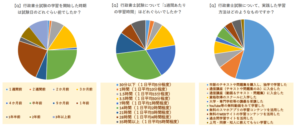 実際に合格した人が「どんな手法で」「いつから」「どれぐらいのペース」で学習していたかは上記の通りです。ただ1点注記したいのが「スクールや講座に入会した人」は「市販のテキスト」もほとんどの人がこなしています。そう考えると完全独学の人は多くないのが実情です。